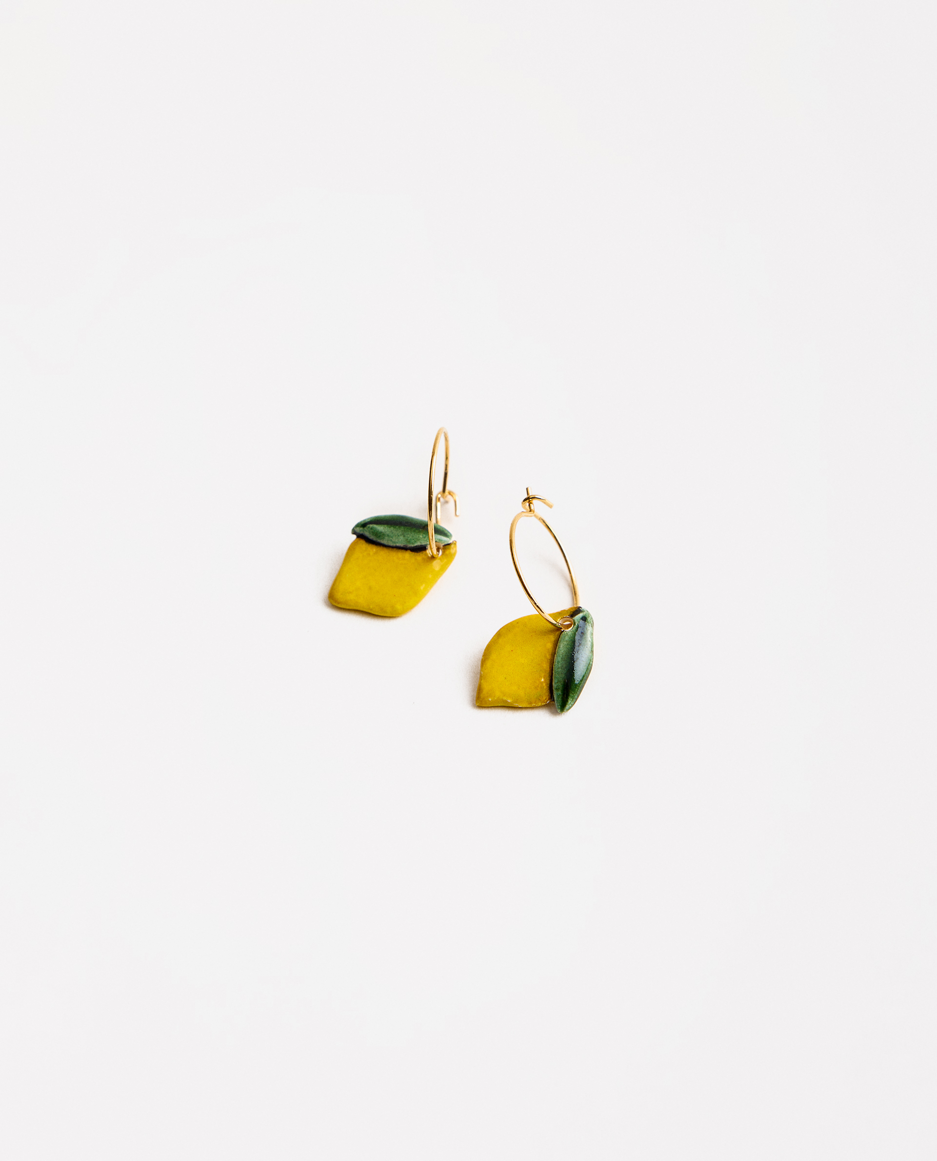 Aros de latón bañados en oro. Limón de cerámica esmaltada.