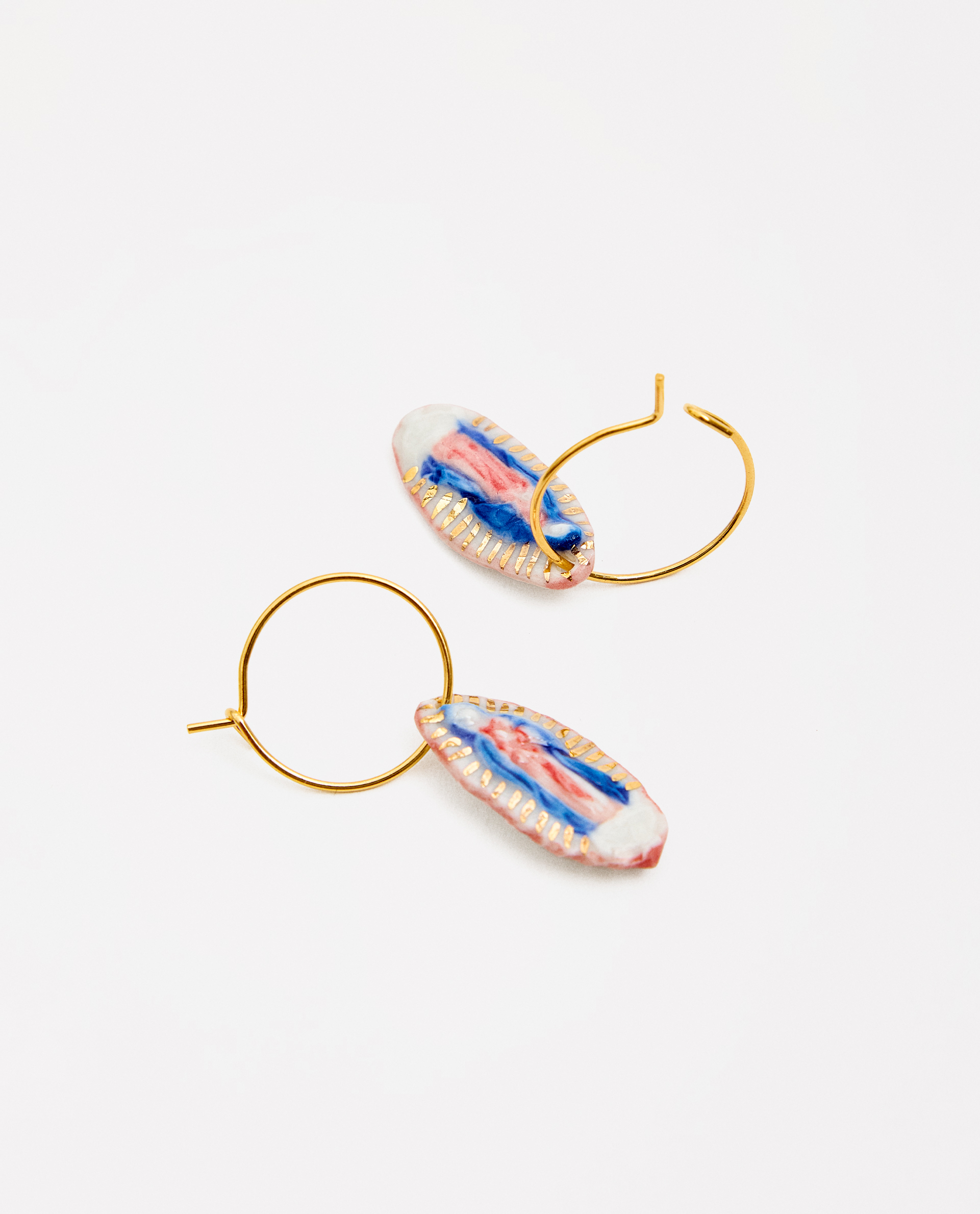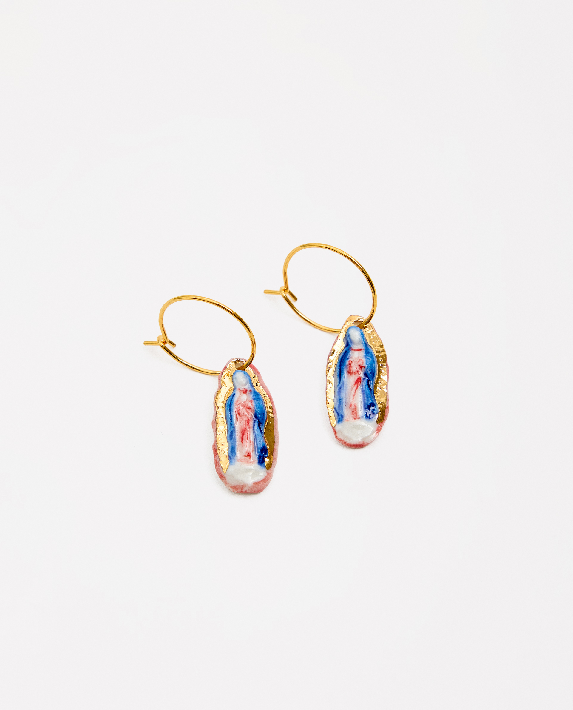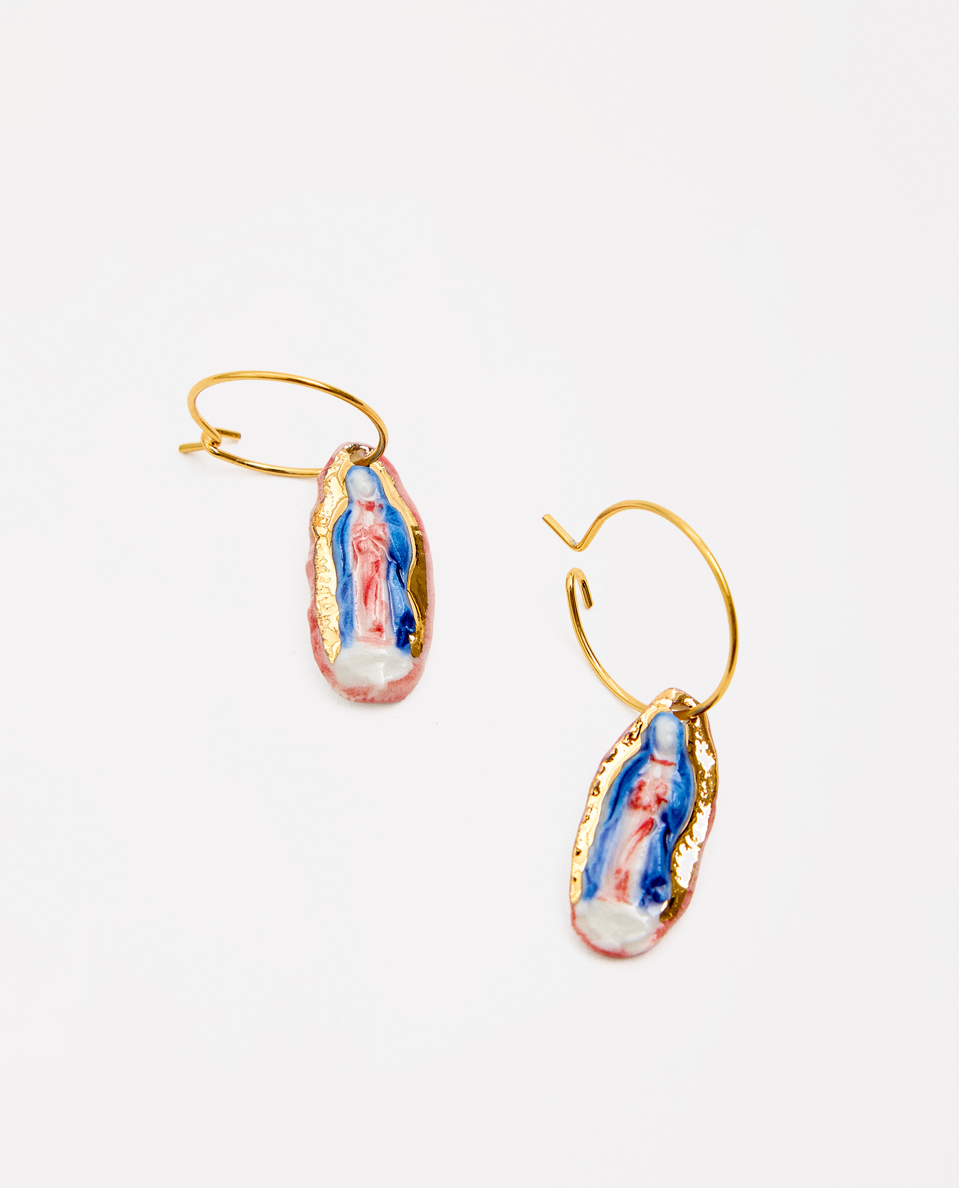 Pendientes arito Virgen de Guadalupe, modelada y pintada a mano, realizada en PORCELANA, cocida a 1230 grados y lustrada en ORO.