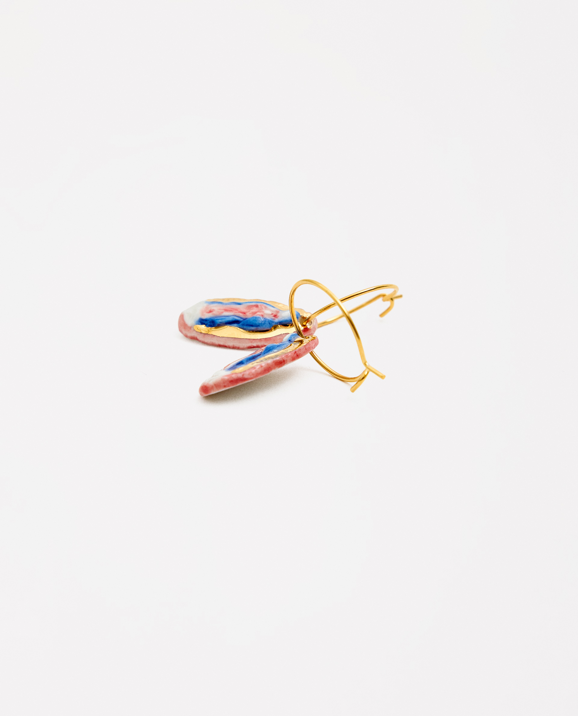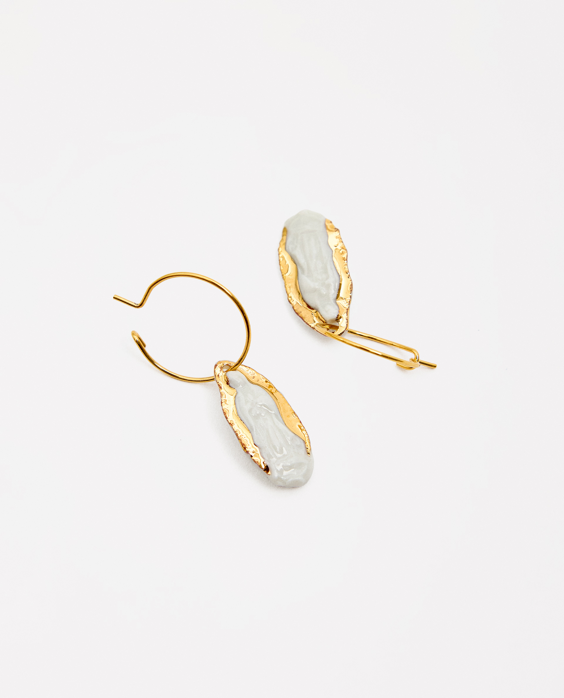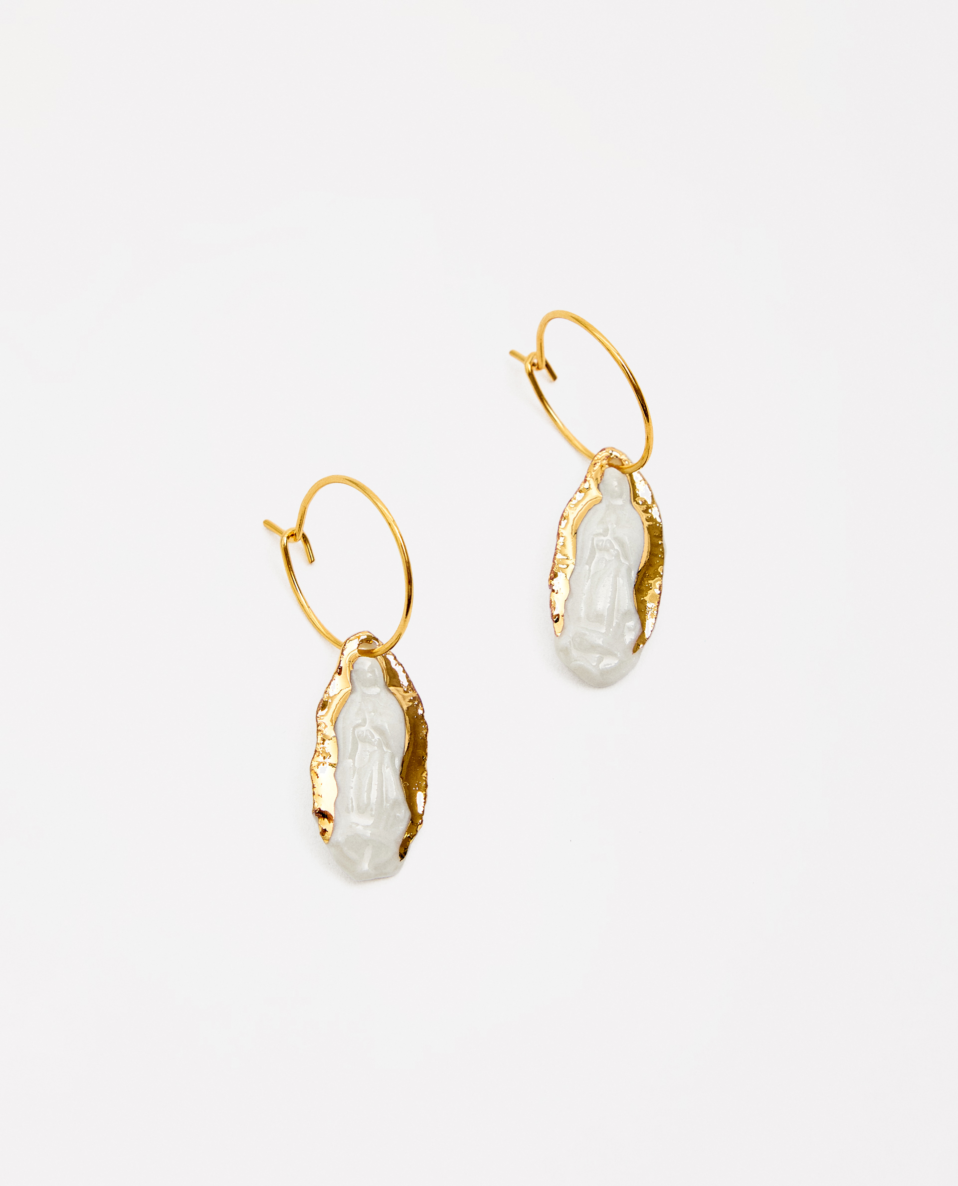 Pendientes arito Virgen de Guadalupe, modelada y pintada a mano, realizada en PORCELANA, cocida a 1230 grados y lustrada en ORO.