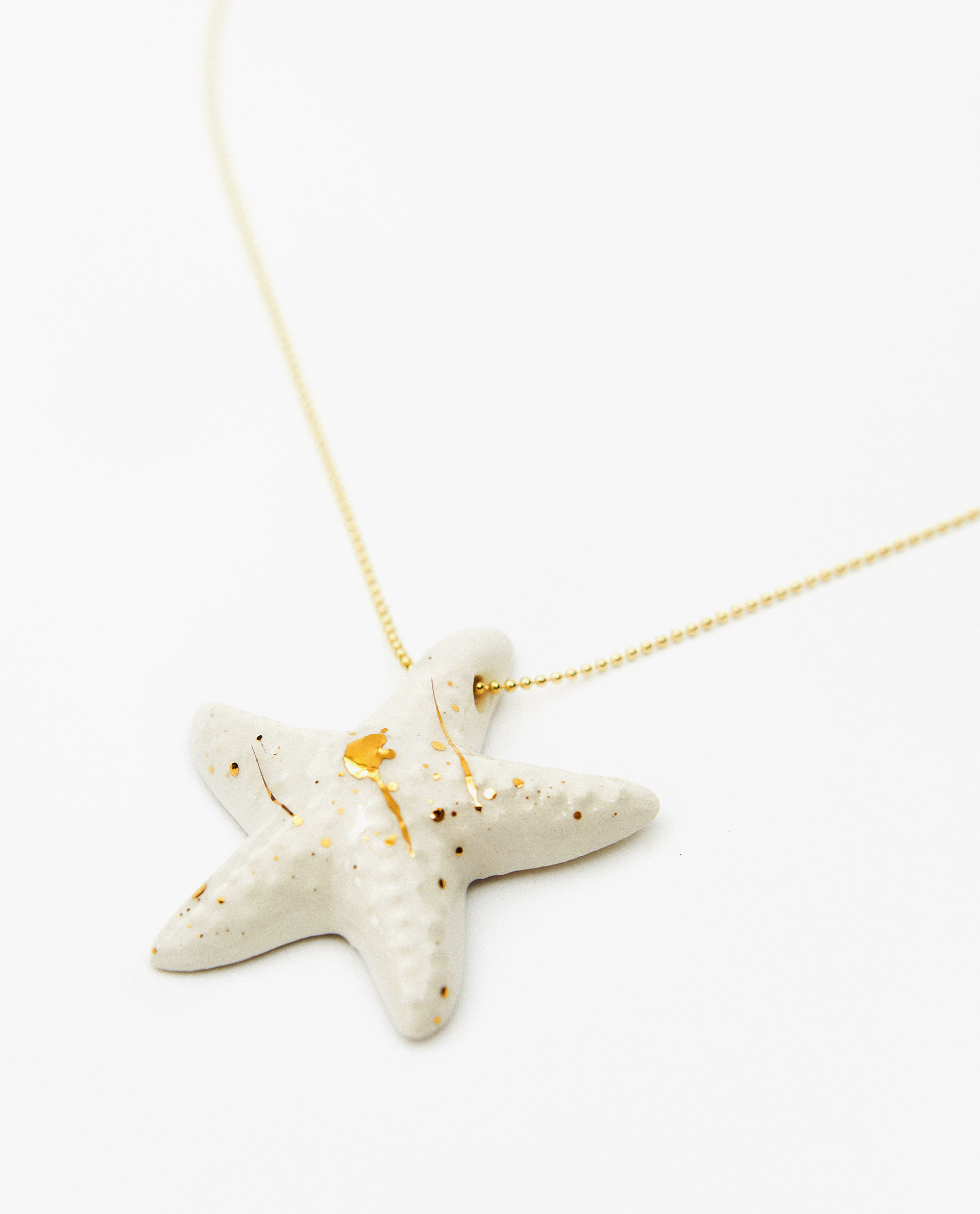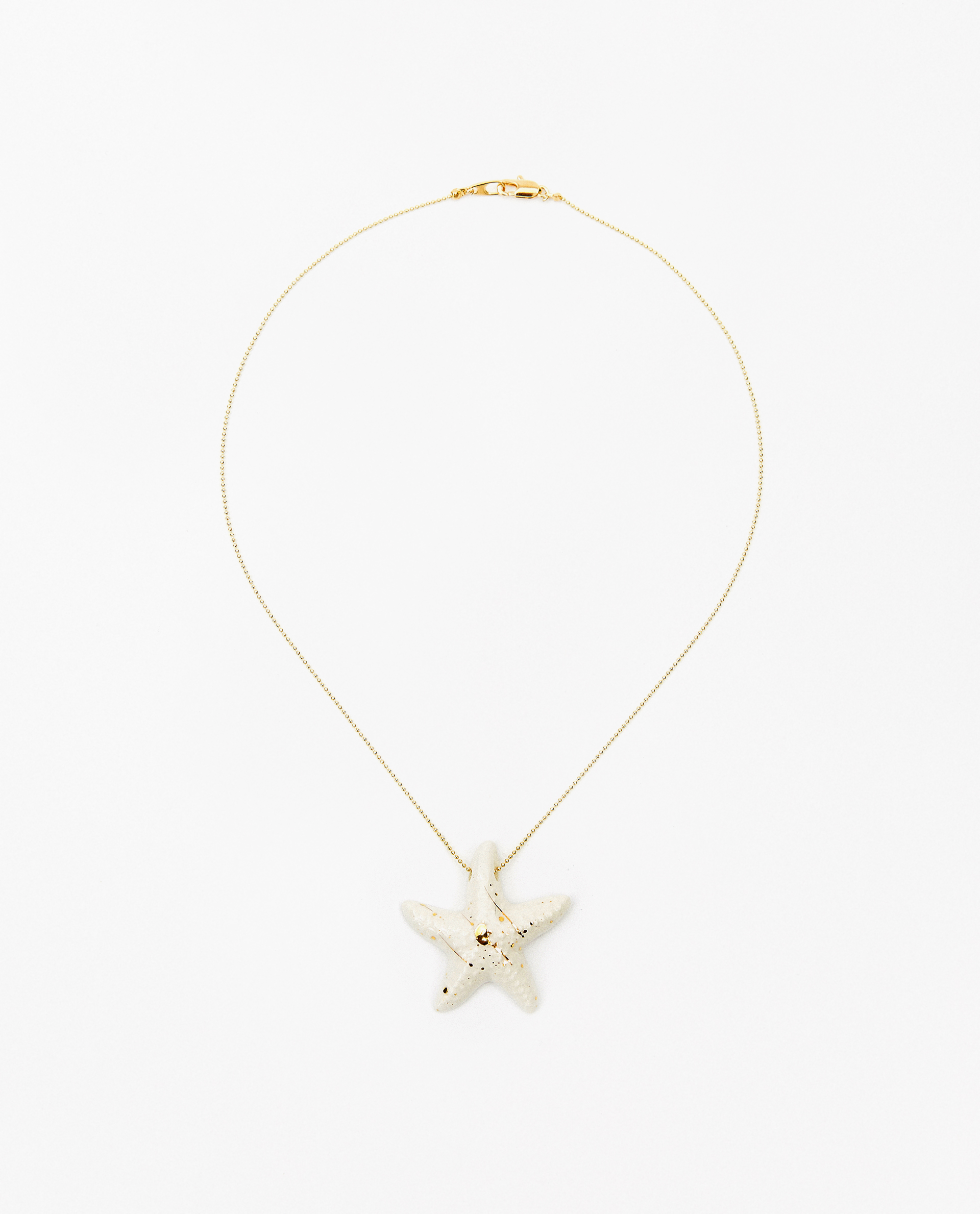 Collar plata bañada en oro, estrella de mar blanca esmaltada en brillo lustra en oro. Largo de la cadena 42 cm (especificar si se desea más larga).