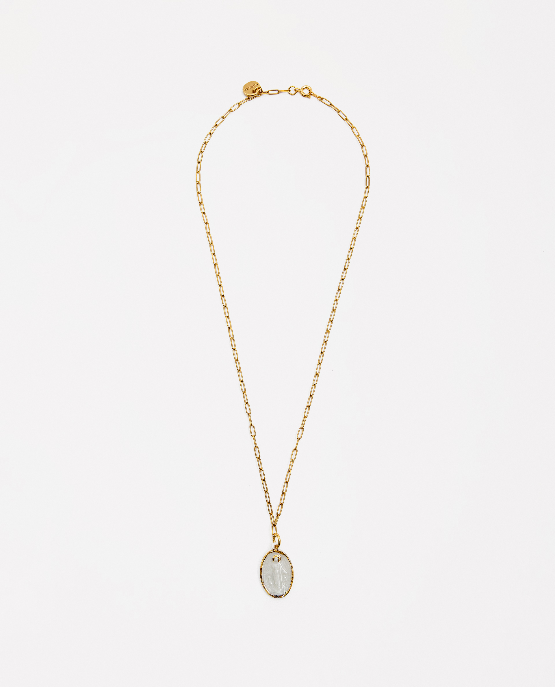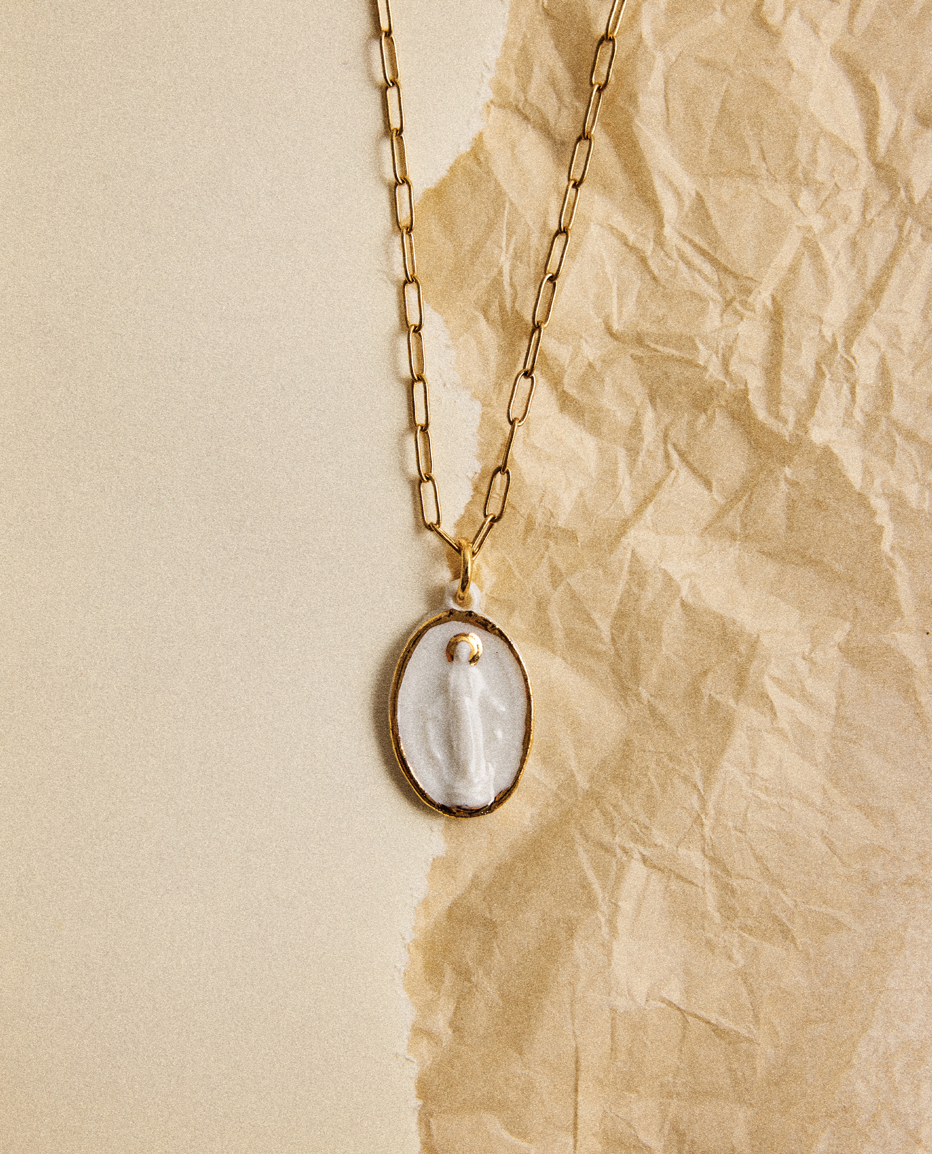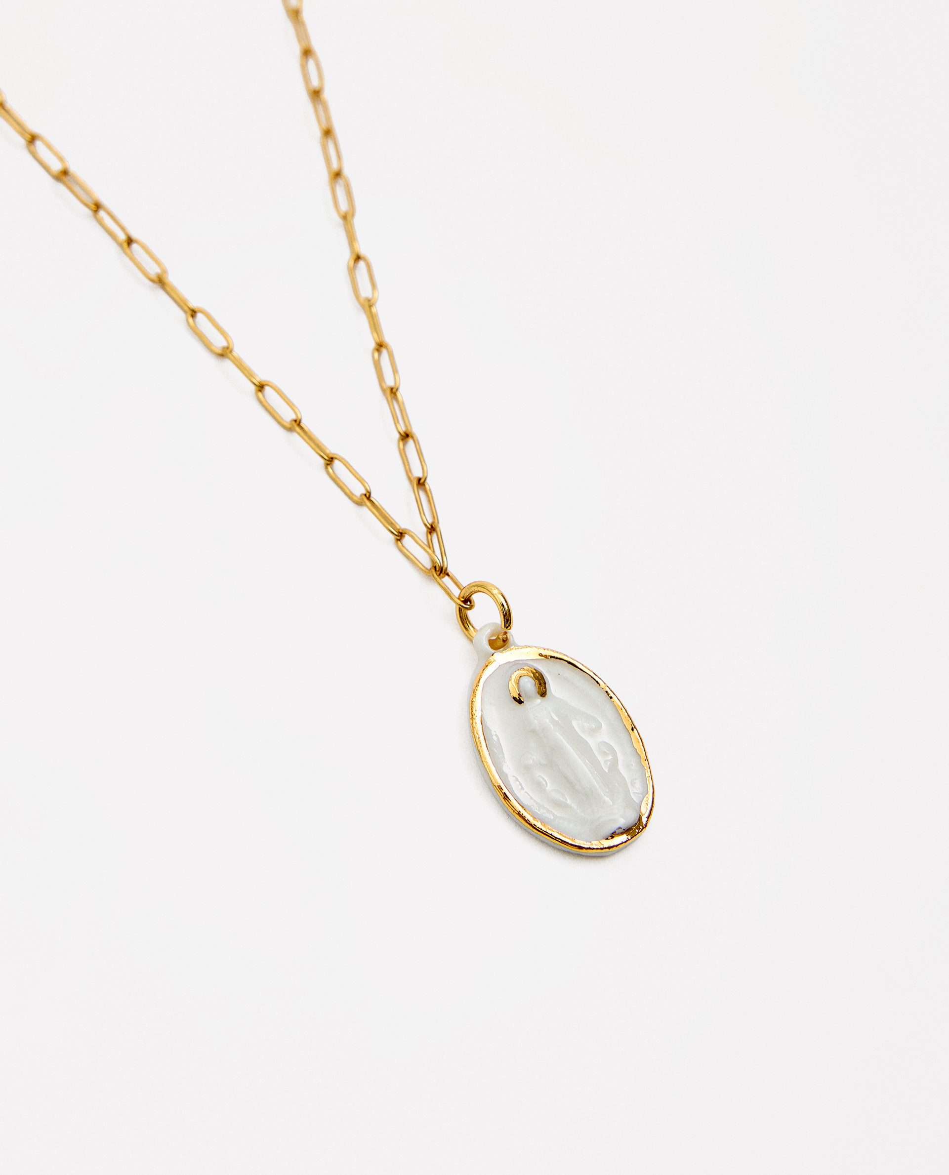 Collar medalla de la Milagrosa, modelada y pintada a mano, realizada en PORCELANA, cocida a 1230 grados y lustrada en ORO.