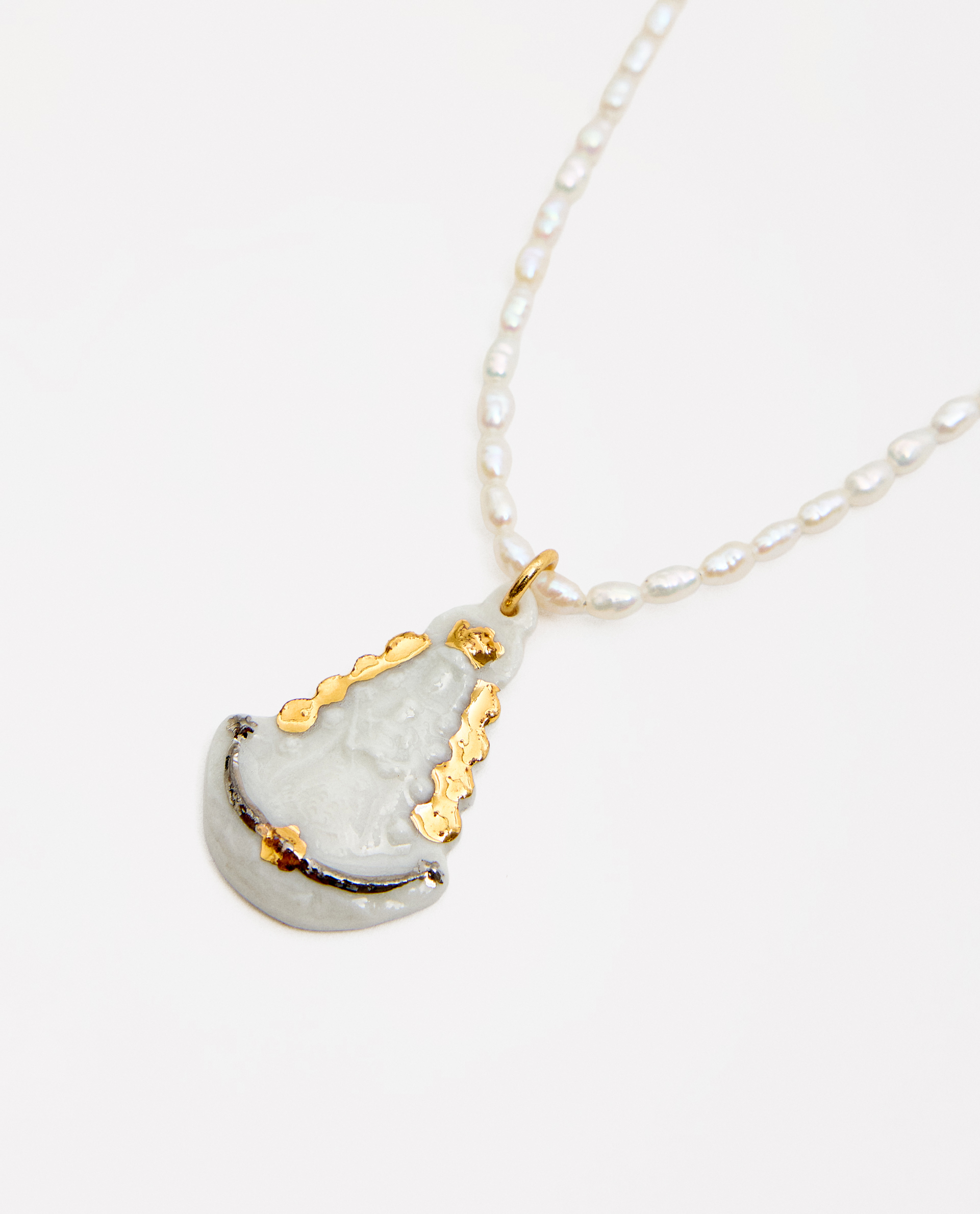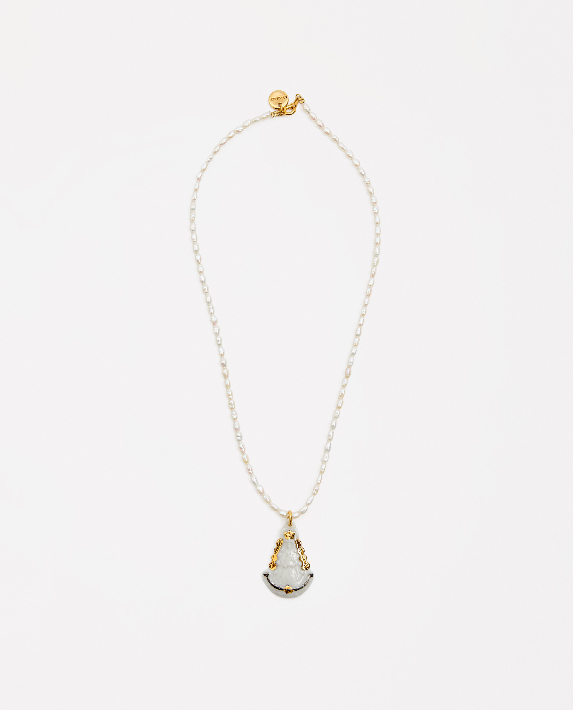 Collar medalla Virgen del Rocío, modelada y pintada a mano, realizada en PORCELANA, cocida a 1230 grados y lustrada en ORO y PLATA.