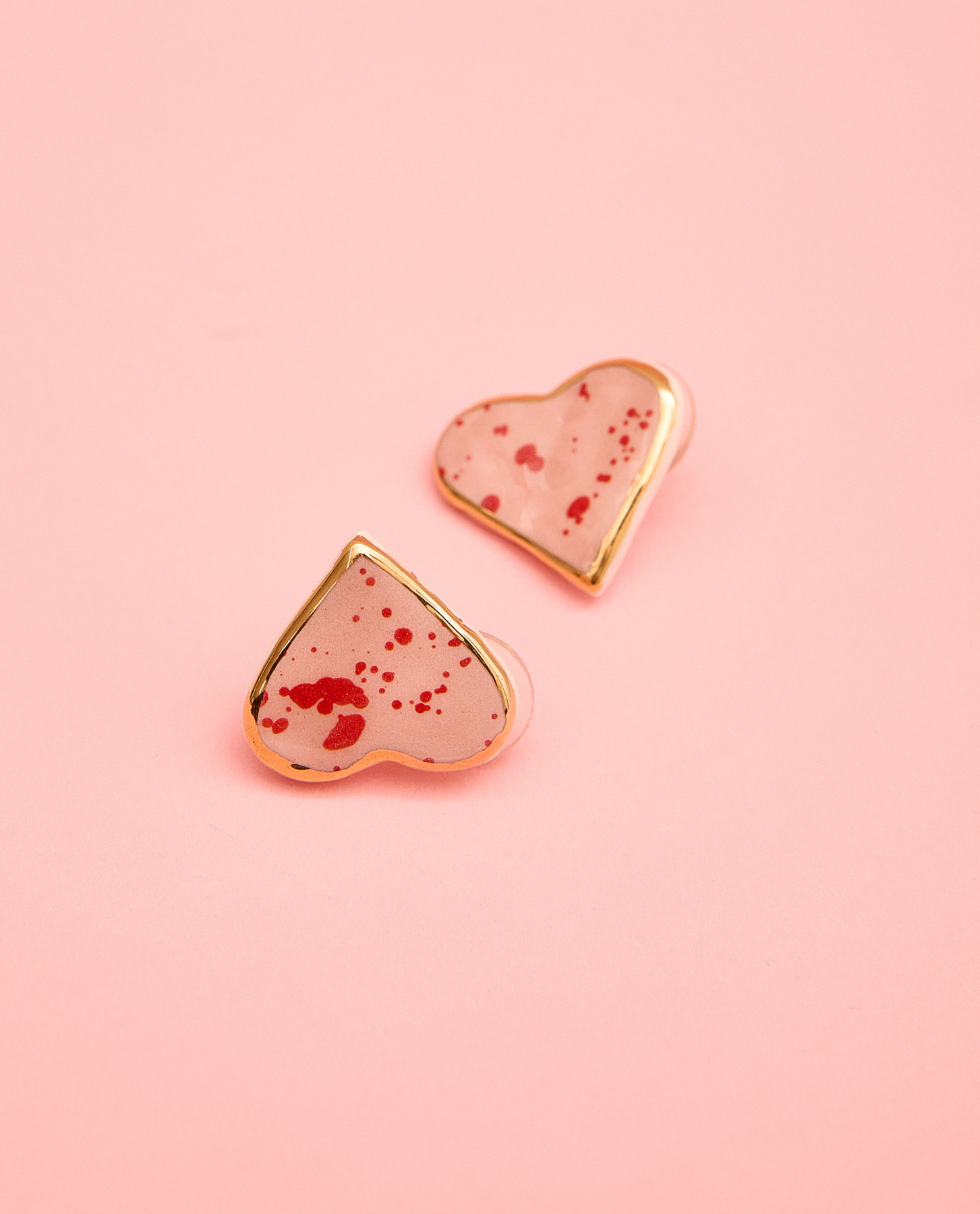 Corazón de cerámica tamaño aproximado 22×22 mm fondo rosa decorado con splash rojo, esmaltado en brillo y perfilado con lustre de oro.