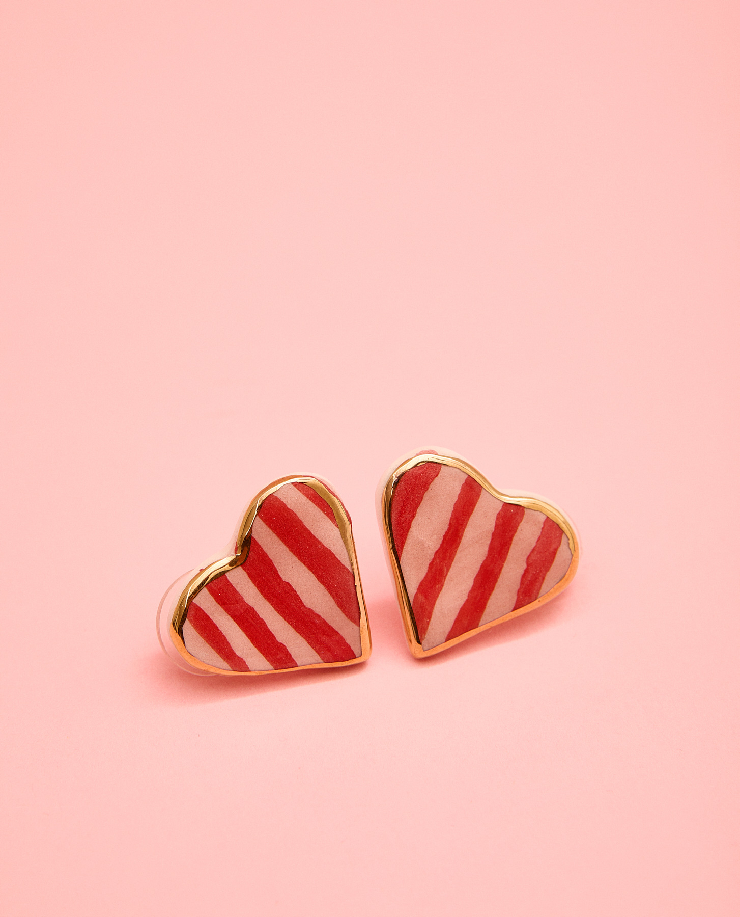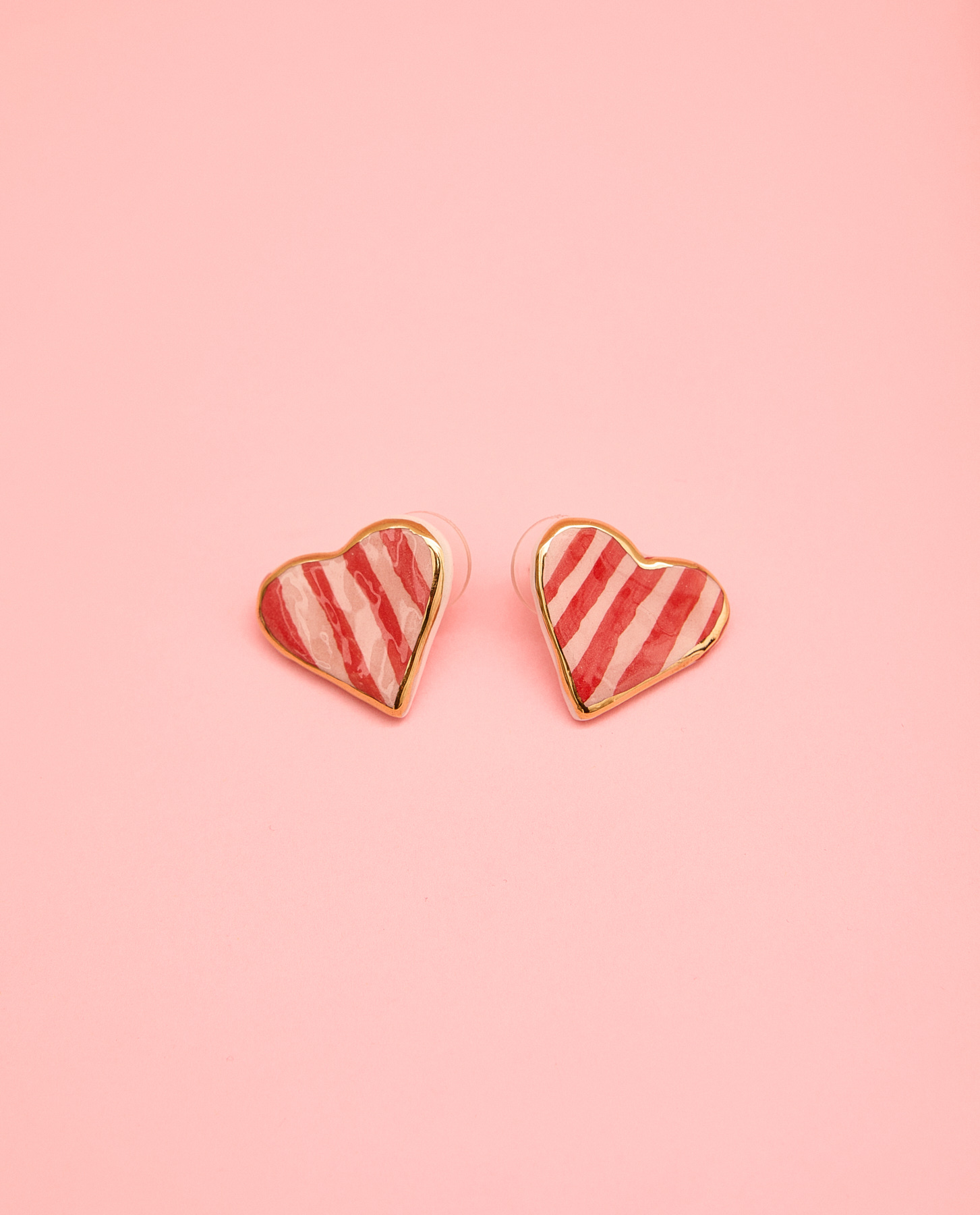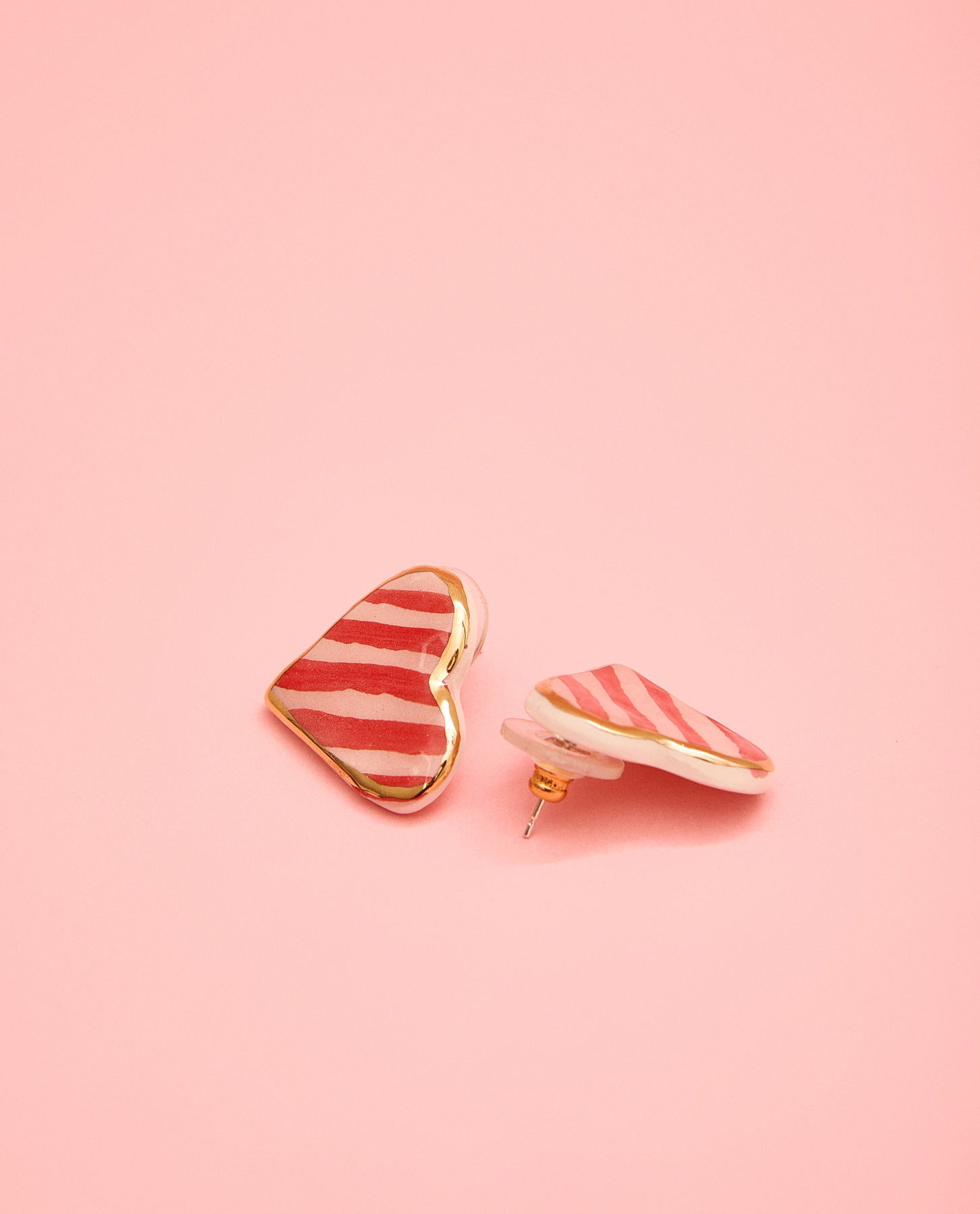 Corazón de cerámica tamaño aproximado 22×22 mm fondo rosa decorado con lineas en rojo, esmaltado en brillo y perfilado con lustre de oro.