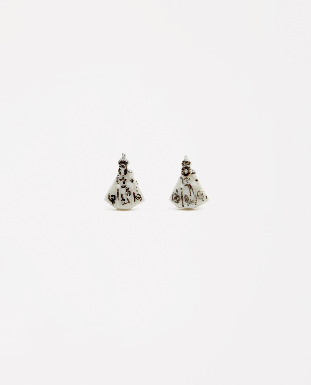 Pendientes Virgen de la Fuensanta, modelada y pintada a mano, realizada en porcelana, cocida a 1230 grados y lustrada en plata.