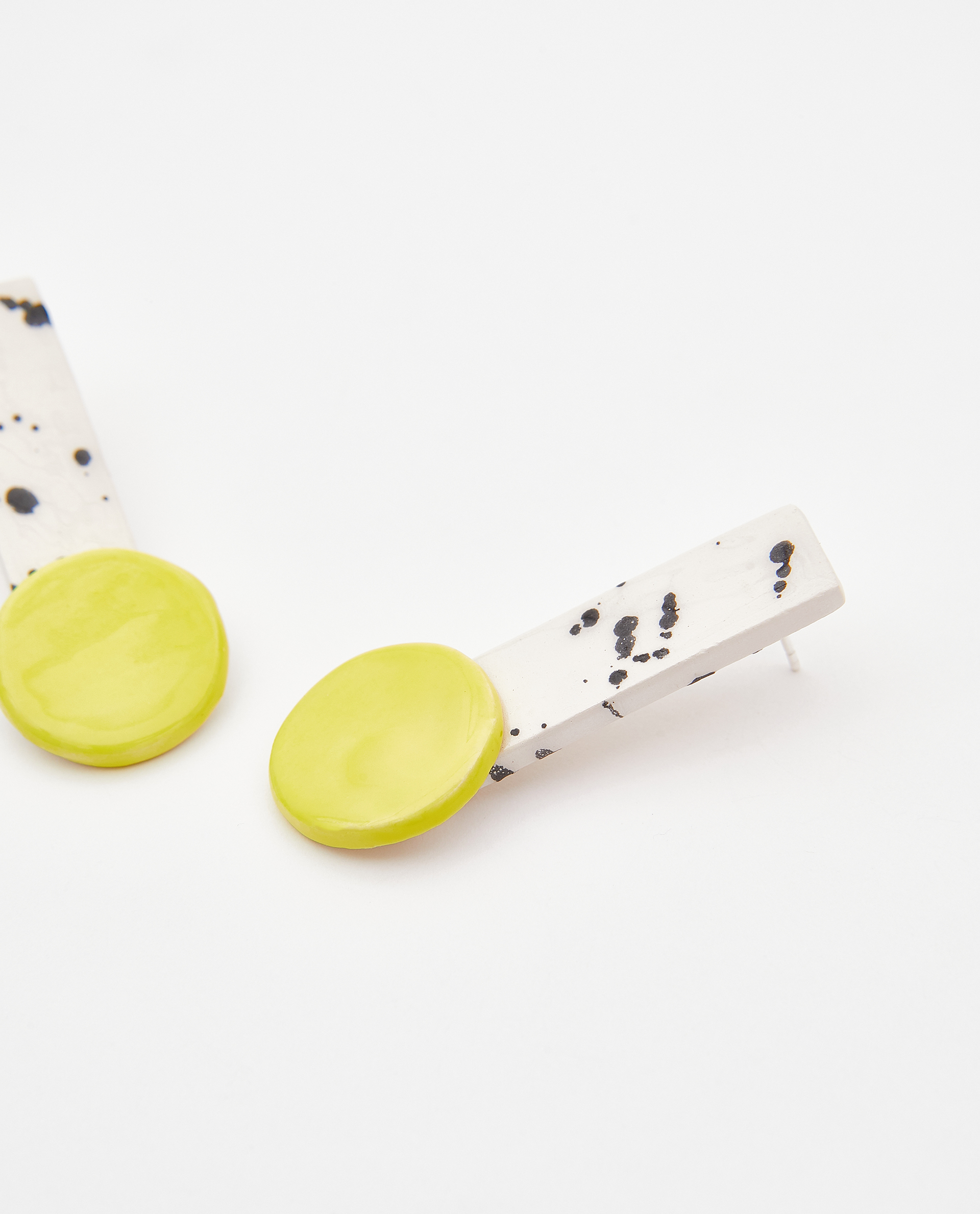 Pendientes rectangular de cerámica blanca esmaltada en brillo y salpicada en óxido negro y amarillo.