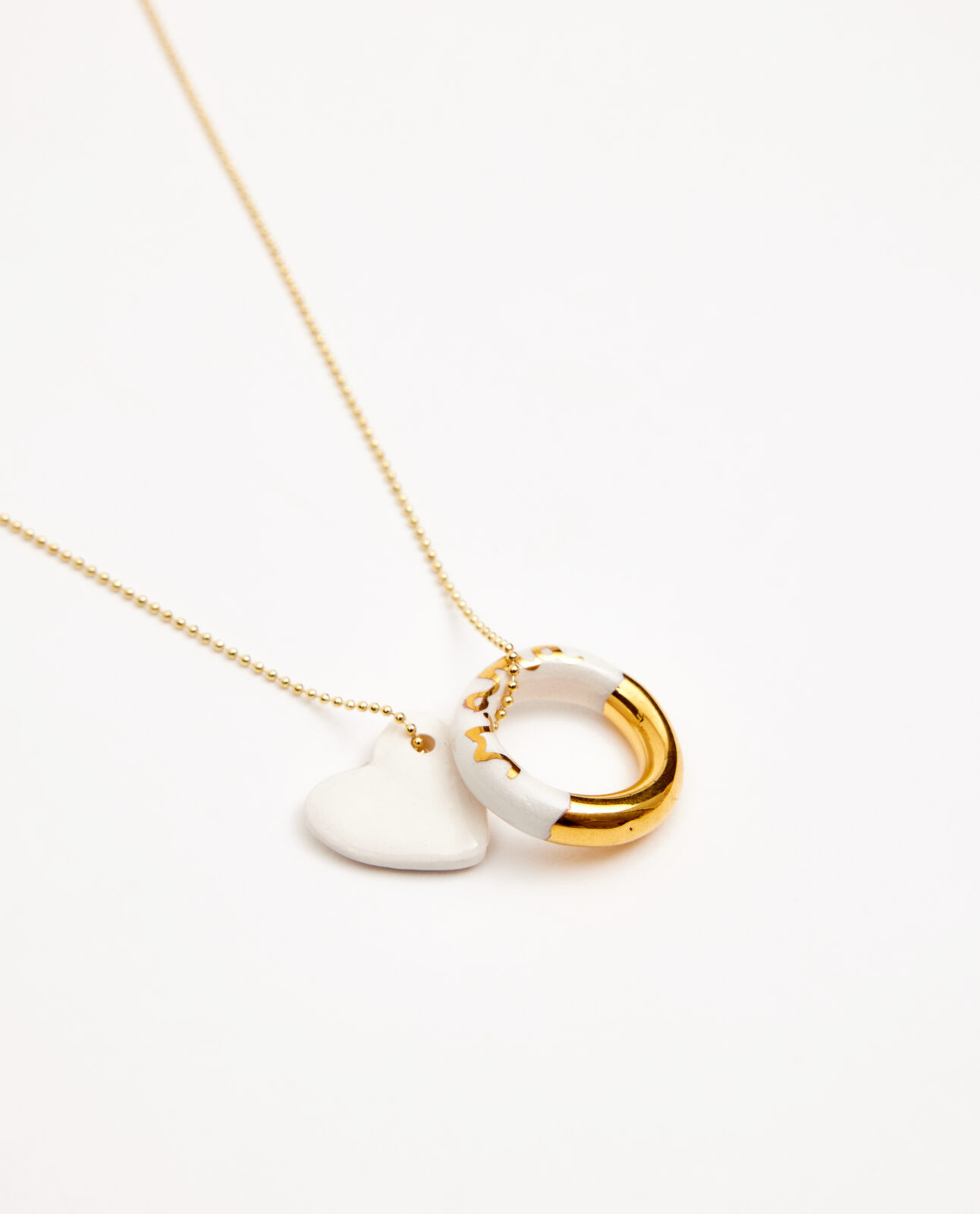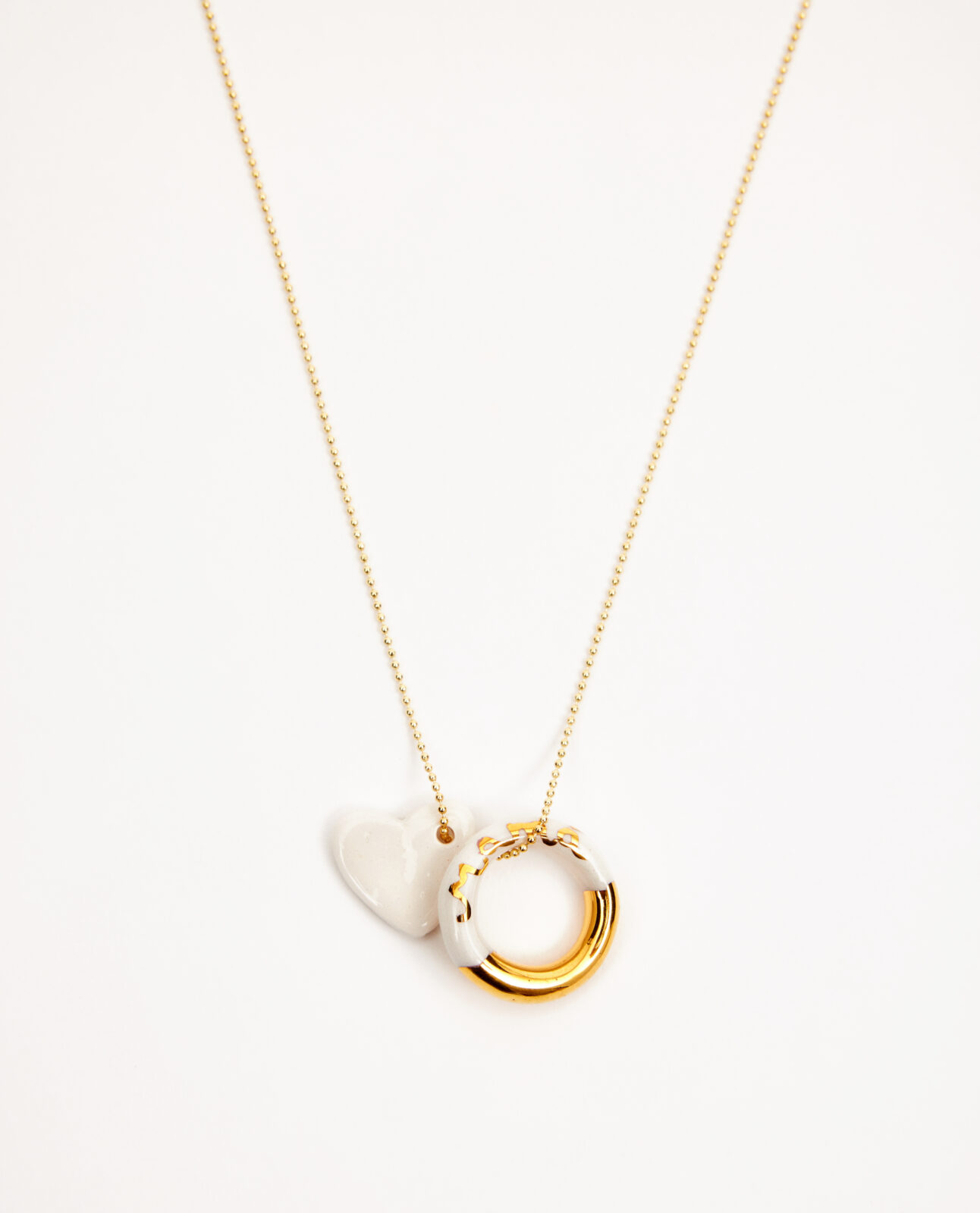 Cadena latón bañada  en oro. Aro de cerámica lustrado en oro texto mamá. Corazón de cerámica esmaltado en brillo.